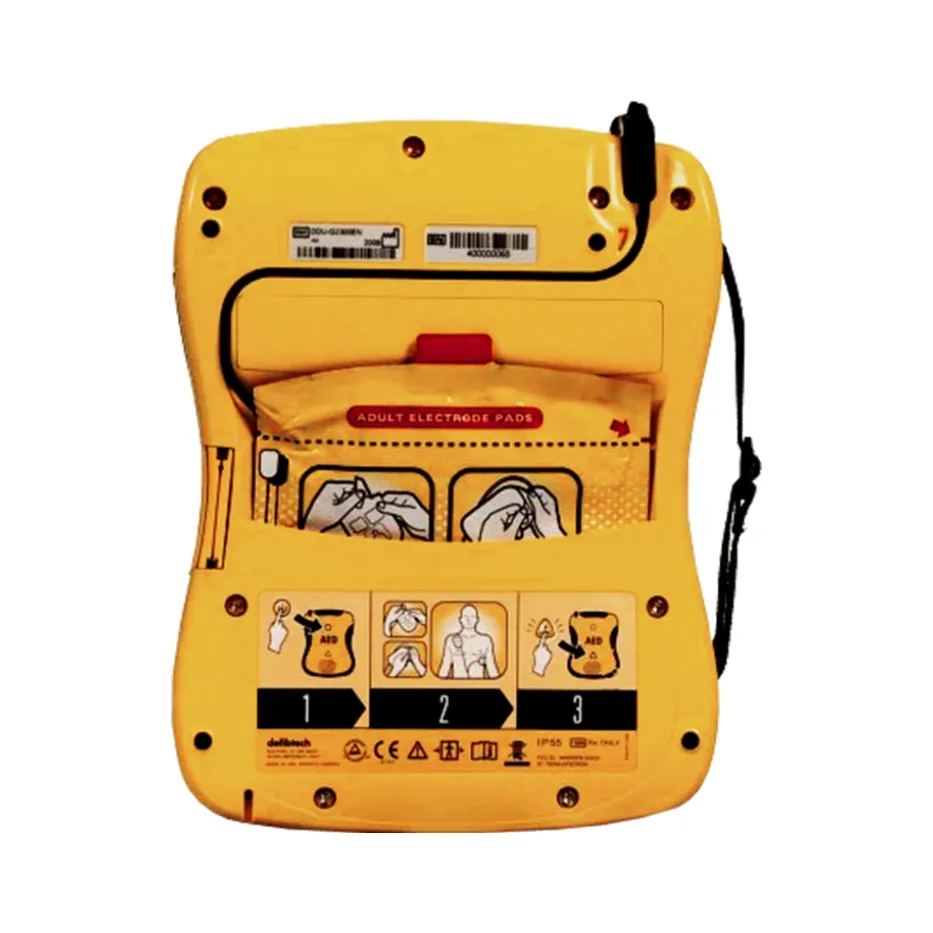 - elektrody są wstępnie podłączone i schowane w kieszonce z tyłu urządzenia, dzięki czemu skraca się czas udzielenia pomocy poszkodowanemu,