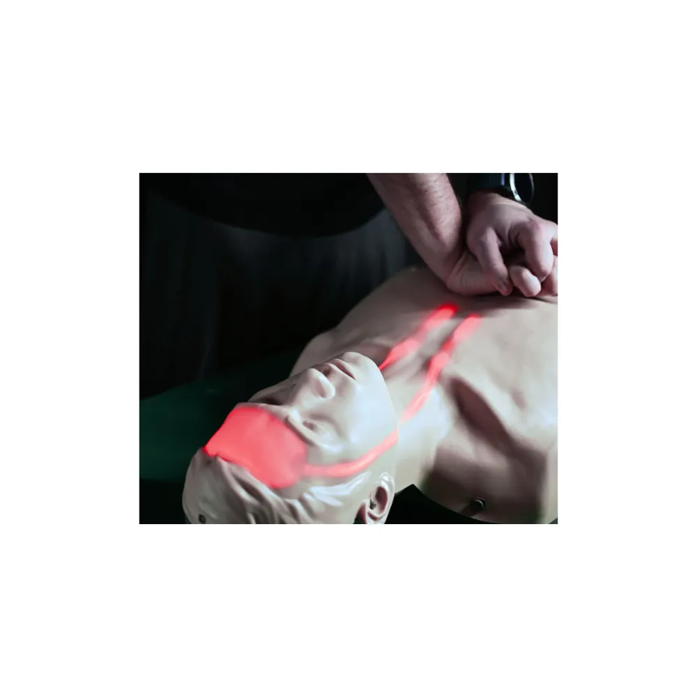 Wbudowane czerwone diody LED obrazują jakościowe efekty resuscytacji krążeniowo-oddechowej i aktywują się wyłącznie wtedy, gdy głębokość oraz szybkość uciśnięć klatki piersiowej są wykonywane prawidłowo, zgodnie z aktualnymi wytycznymi ERC. Natomiast czoło manekina podświetla się intensywnym czerwonym światłem, sygnalizując, że prowadzona RKO osiąga jakość wystarczającą do zapewnienia przepływu natlenionej krwi do mózgu.