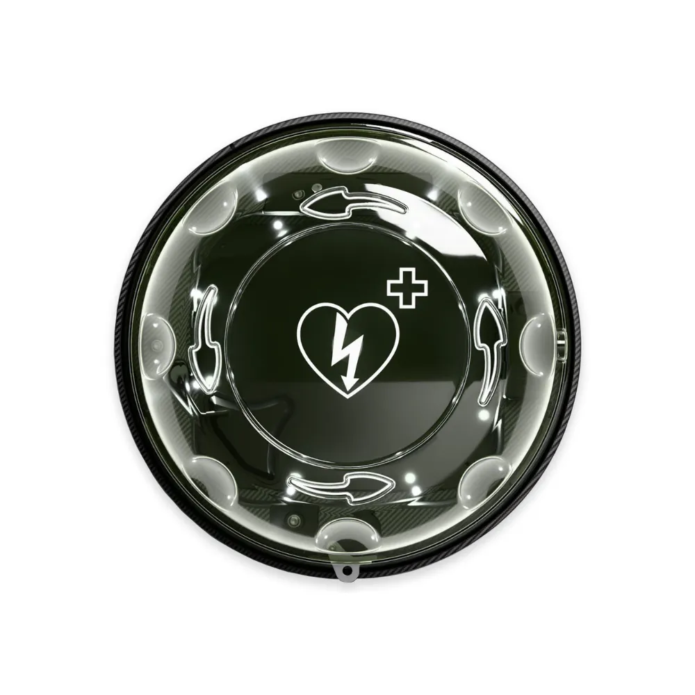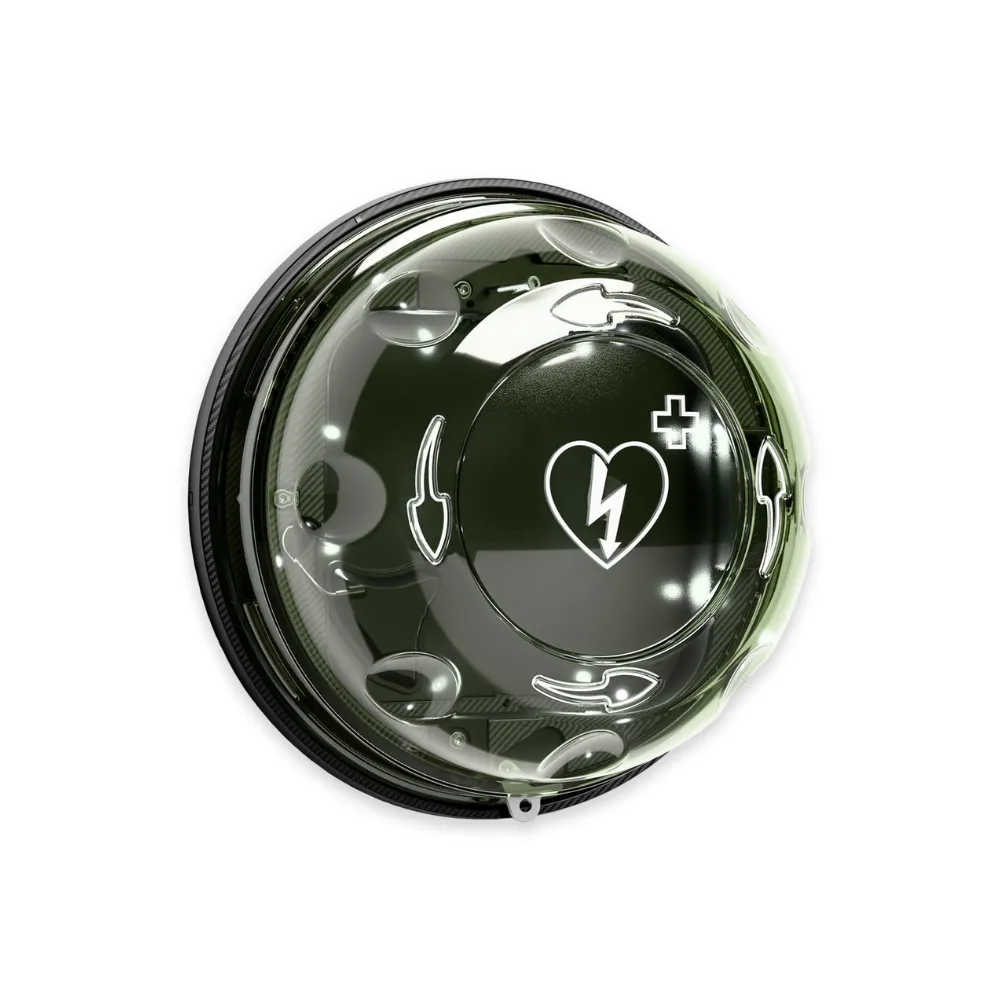 Transparentna pokrywa pozwala na szybkie zlokalizowanie urządzenia, a wbudowany alarm dźwiękowy i oświetlenie LED zwiększają bezpieczeństwo oraz widoczność AED – także w nocy lub w warunkach słabej widoczności. Dodatkowo kapsuła posiada funkcję ogrzewania, co zabezpiecza defibrylator przy ujemnych temperaturach, chroniąc jego baterię i utrzymując gotowość do użycia.