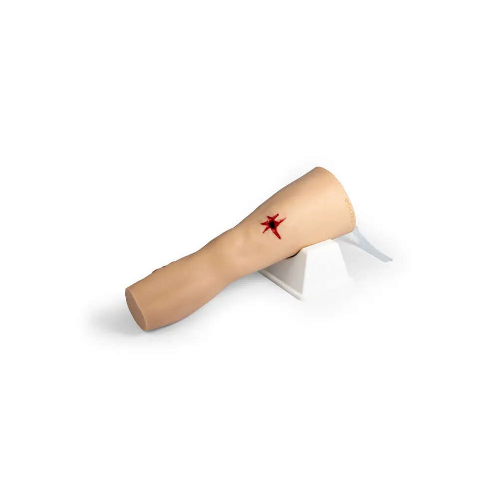 Trenażer nogi do tamowania krwotoku „Trauma Tim” to realistyczny symulator urazowy kończyny dolnej, zaprojektowany do zaawansowanego szkolenia z zakresu medycyny ratunkowej i kontroli masywnych krwotoków. Model obejmuje obszar od uda do środkowej części łydki i odwzorowuje anatomicznie poprawną budowę naczyń krwionośnych oraz struktur kostnych, co pozwala na prowadzenie bardzo realistycznych scenariuszy treningowych. Symulator umożliwia ćwiczenie różnych technik tamowania krwawienia tętniczego, w tym stosowania opasek uciskowych zgodnie z wytycznymi TCCC oraz pakowania ran. Dzięki trwałej konstrukcji model jest przystosowany do intensywnego użytkowania w wymagających warunkach szkoleniowych, a regulacja przepływu krwi pozwala na dostosowanie poziomu trudności ćwiczeń.